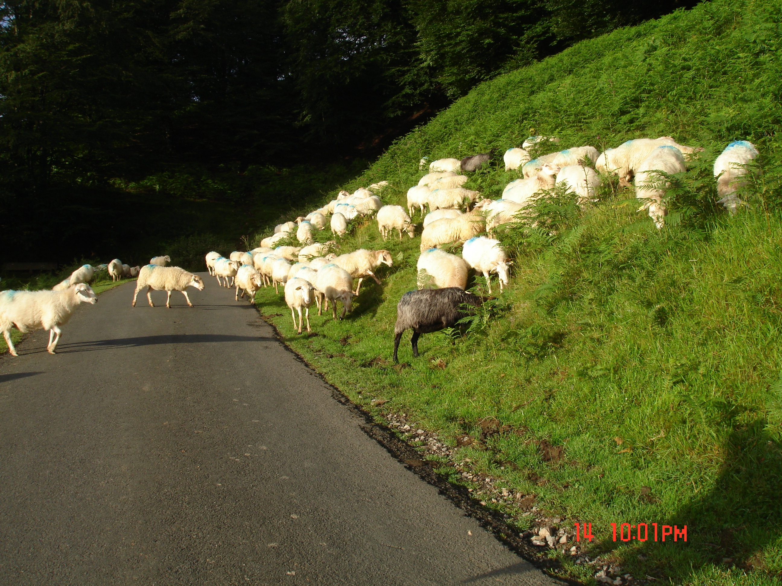 flock of sheep walk across my path with one black sheep that stood out by